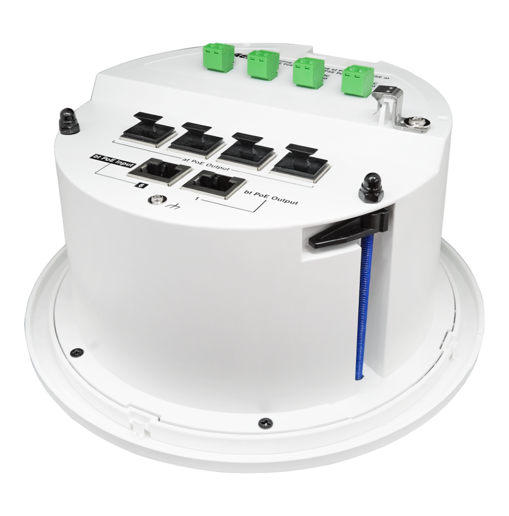 Una delle caratteristiche distintive è la capacità di daisy-chain fino a 300 metri su cavo Cat 5e/6, superando il limite standard PoE. Questo consente di estendere l’infrastruttura senza ricorrere a switch intermedi o alimentatori esterni, riducendo drasticamente i costi di installazione. La configurazione prevede 1 porta PD input (bt PoE) e 5 porte PSE output (1x bt PoE + 4x at PoE), rendendo possibile l’alimentazione di telecamere, access point WiFi e altri dispositivi di rete da un’unica fonte.