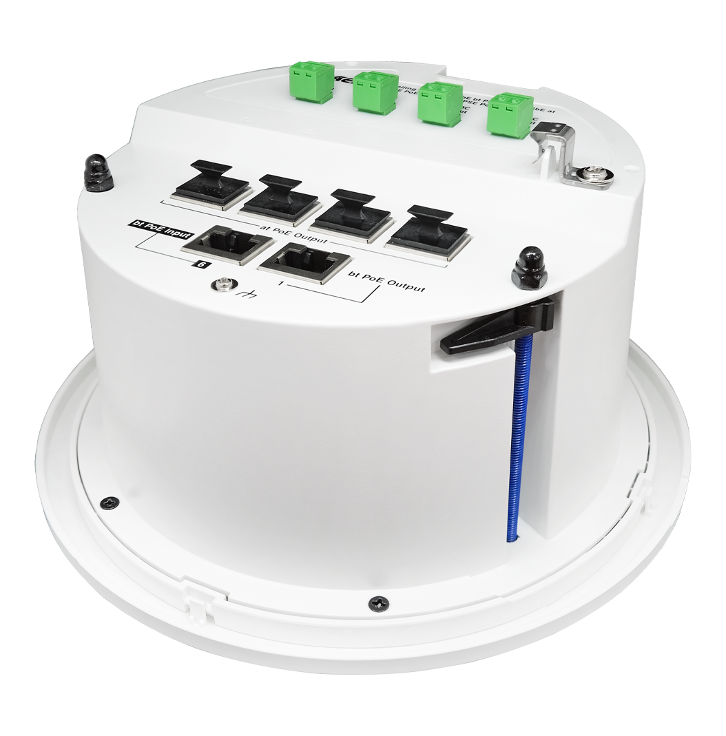 Le dimensioni compatte (H90×φ185mm) e il form factor circolare rendono l’installazione a soffitto discreta e veloce, con apertura consigliata di φ150mm. L’eliminazione del cablaggio elettrico tradizionale riduce i rischi legati alla sicurezza e semplifica le operazioni di espansione o modifica dell’impianto. Gli indicatori LED per SYS, PWR, LAN, PoE, 12VDC, 24VDC, DI e DO permettono un diagnostic visivo immediato.