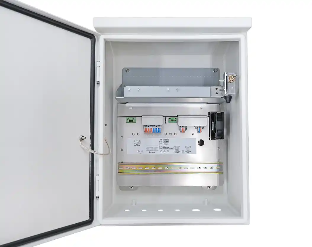 Il sistema è inoltre predisposto per un open alarm switch, utile per la segnalazione fisica di apertura non autorizzata dell’armadio — un dettaglio che va oltre la mera alimentazione e introduce un layer di sicurezza fisica sull’housing stesso.