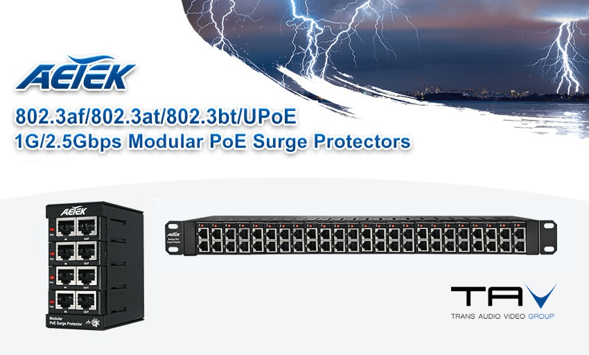 Aetek annuncia il nuovo Surge Protector PoE modulare con 802.3af / 802.3at / 802.3bt / UPoE - 10 M / 100 M / 1 G / 2,5 G bps.