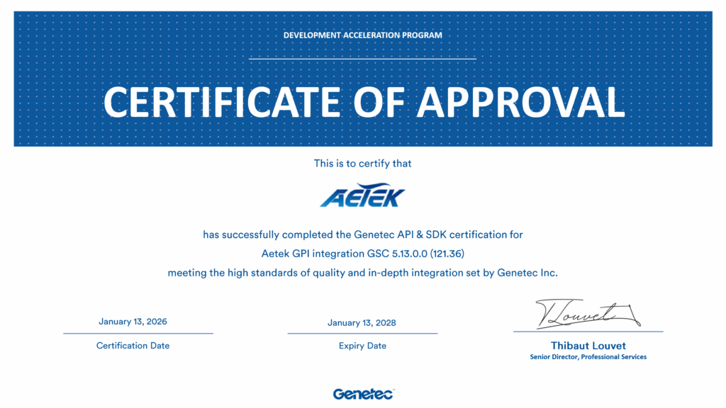 AETEK ha anticipato che ulteriori dettagli sulle capacità complete della propria integrazione GPI saranno resi disponibili nelle prossime settimane. L’azienda sta lavorando su funzionalità avanzate che sfrutteranno le API di ultima generazione di Genetec, incluso il supporto per edge analytics e integrazione con sistemi IoT.