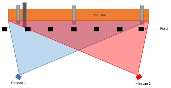 L’immagine qui sotto è stata scattata durante la messa in funzione degli scanner Kilnscan per Tasek in Malesia. In questa tipica configurazione complessa, la linea di vista di ogni scanner era ostruita da diversi pali e pilastri. In configurazioni simili, la soluzione migliore per il monitoraggio termico prevede 2 o 3 teste di scansione.