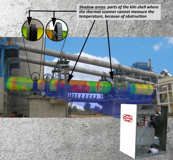 sull’intera lunghezza del mantello del forno, senza zone morte, vengono installati diversi sensori termici a punti, chiamati pirometri a ombra, davanti alle zone d’ombra, vicino al mantello. Questi sono collegati all’unità di ricezione KILNSCAN, che opera come un hub di dati e unisce le informazioni sulla temperatura di tutti i sensori, per visualizzare la mappa termica completa e senza soluzione di continuità del mantello del forno.