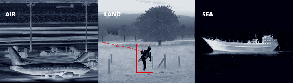 - Confini e frontiere: sorveglianza passiva su ampie estensioni territoriali con rilevamento automatico di attraversamenti non autorizzati, efficace anche in condizioni ambientali estreme.