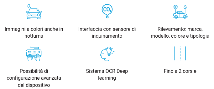 Oltre alla classica cattura del numero di targa, ha funzioni di video analisi molto avanzate, quali marca, modello e colore del veicolo. Dispone inoltre della possibilità di invio e registrazione delle immagini di contesto chiare anche di notte.
