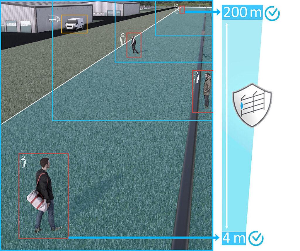 La Panomera® S4 Perimeter si distingue inoltre per la sua Ultra Wide Dynamic Range (UWDR) e la capacità di mantenere una risoluzione di riconoscimento superiore a 125 px/m su tutta la distanza di copertura, in conformità con la normativa DIN 62676-4.