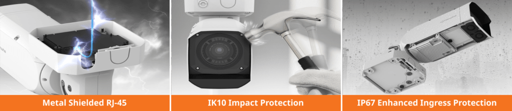 Progettata per resistere alle condizioni più difficili, la TNO-A26081 è certificata IP66/IP67 per la protezione contro polvere e acqua, IK10 per la resistenza agli urti e conforme agli standard NEMA4X per l’uso in ambienti estremi. Queste certificazioni garantiscono che la telecamera possa operare in modo affidabile anche in presenza di pioggia, polvere, temperature estreme o tentativi di vandalismo. Inoltre, i terminali RJ-45 schermati in metallo offrono una protezione aggiuntiva contro le sovratensioni, aumentando la durabilità complessiva del dispositivo. Questa robustezza la rende ideale per applicazioni in ambienti esterni, come cantieri, porti o aree urbane, dove le condizioni possono essere particolarmente impegnative.