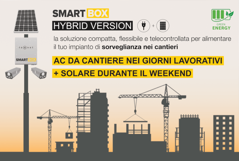 Townet SmartBox, disponibile in 3 versioni, a seconda delle fonti energetiche desiderate, è la soluzione rapida e affidabile per alimentare e telecontrollare dispositivi PoE o DC come telecamere di video sorveglianza e dispositivi di telecomunicazione wireless o hot spot wifi.